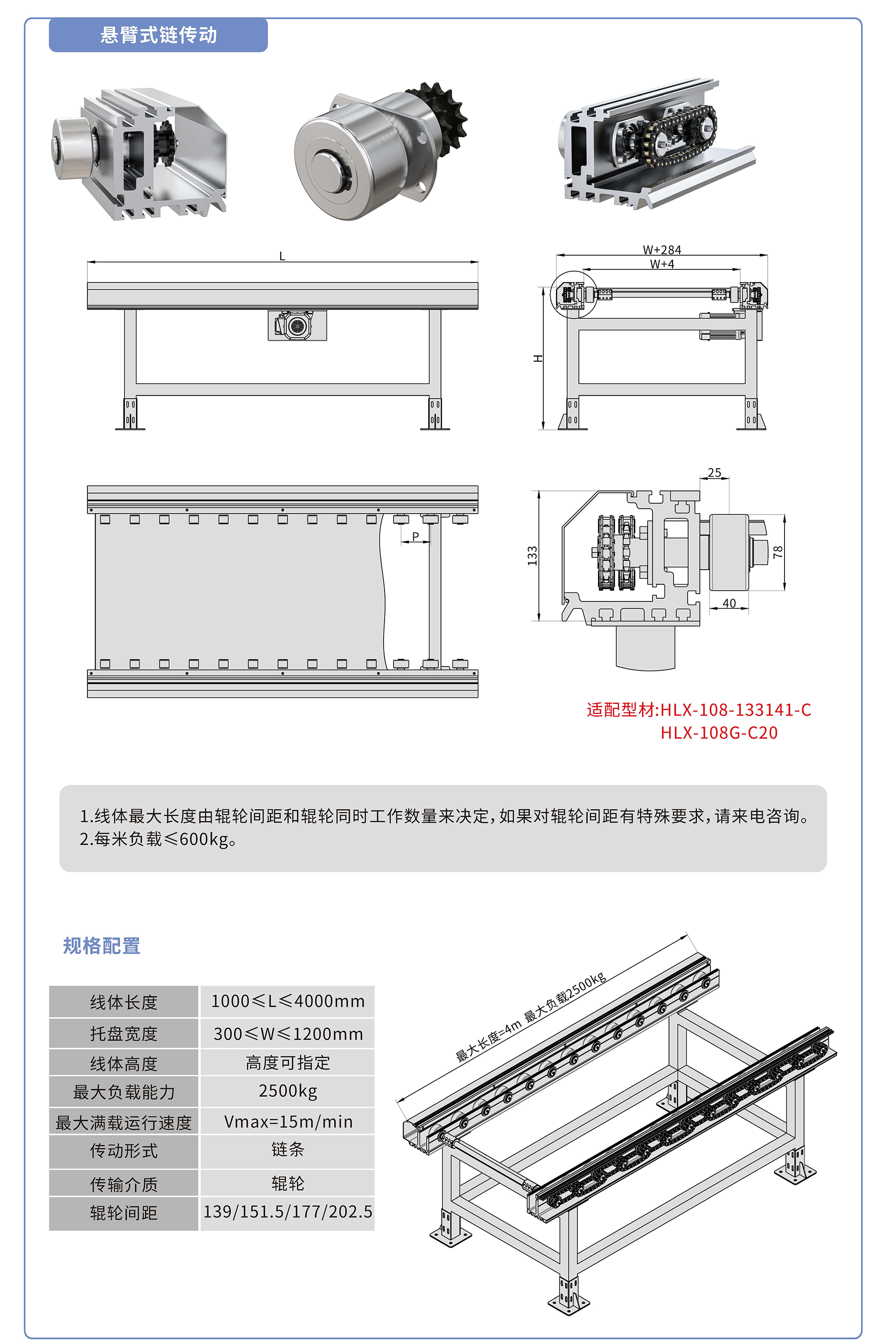 采用133141鋁型材,鏈輪傳動,鍍鉻滾輪鑲嵌銅套實現(xiàn)積放功能,負載2500kg/米,最大負載速度15M/min, 輪距139、151.5、177、202.5可選,適用托盤寬度300-1200mm,線體長度范圍1000-4000mm, 高度根據(jù)需求定制.