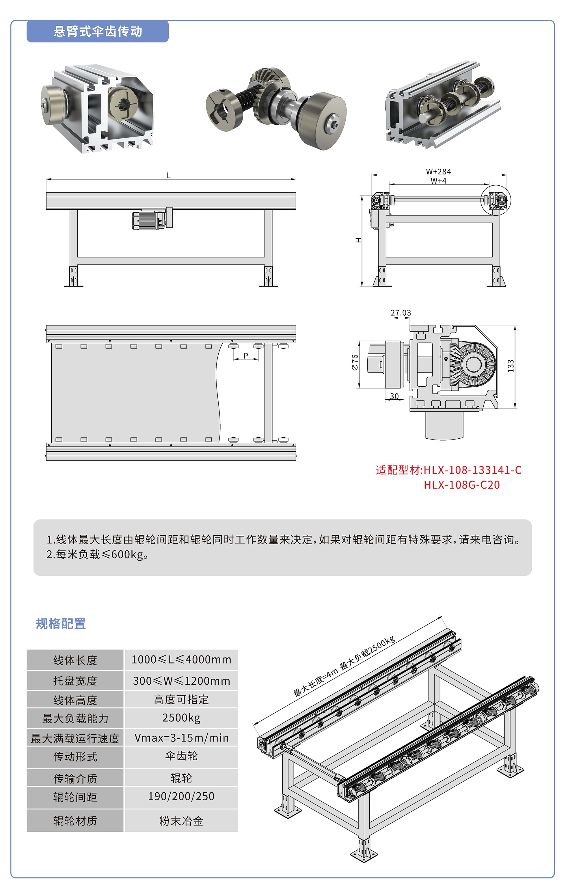 采用133141鋁型材,傘齒驅(qū)動,粉末冶金滾輪鑲嵌銅套實現(xiàn)積放功能,負載2500kg/米,最大負載速度15M/min, 輪距190、200、250可選,適用托盤寬度300-1200mm,線體長度范圍1000-4000mm, 高度根據(jù)需求定制.